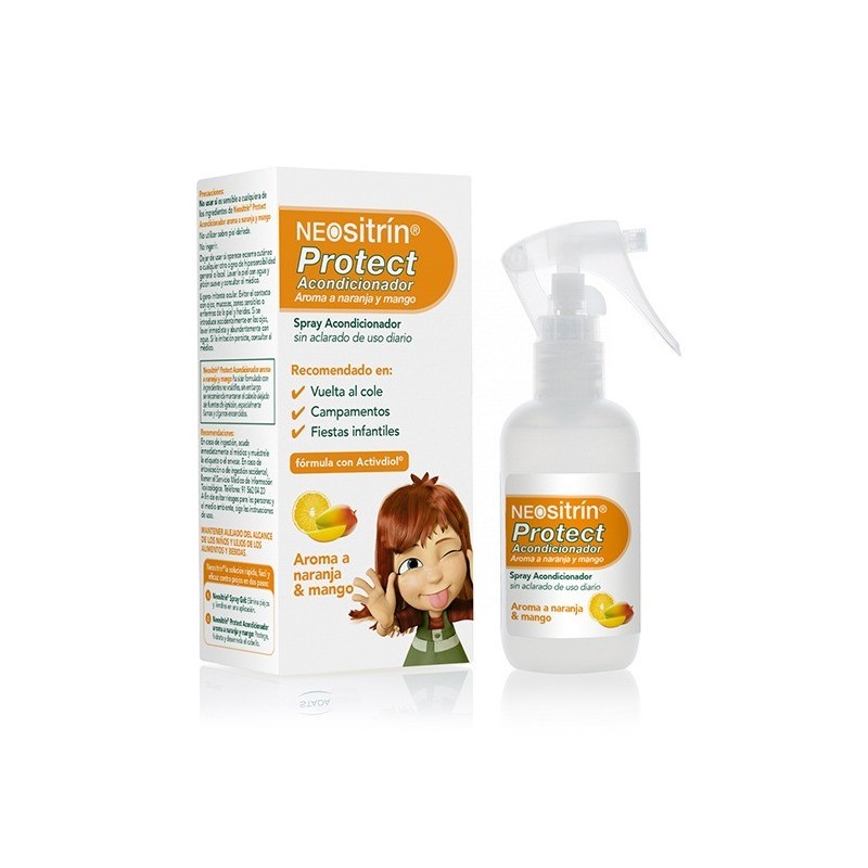 Neositrín®Protect es un spray acondicionador de uso diario que te permite conseguir un pelo desenredado y protegido sin aclarar. Eliminando los piojos que puedan entrar en contacto con el cabello.