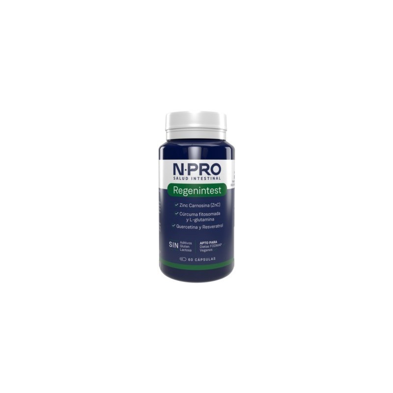 Npro REGENintest es un producto diseñado para regenerar y cuidar el epitelio intestinal y la mucosa, gracias a su acción regeneradora. Su formulación, compuesta por aminoácidos, plantas antiinflamatorias y antioxidantes, fortalece la barrera intestinal y refuerza los mecanismos naturales de defensa contra la degradación de la mucosa. Está especialmente diseñado para personas con intolerancias alimentarias, como la enfermedad inflamatoria intestinal, sin incluir probióticos o prebióticos.