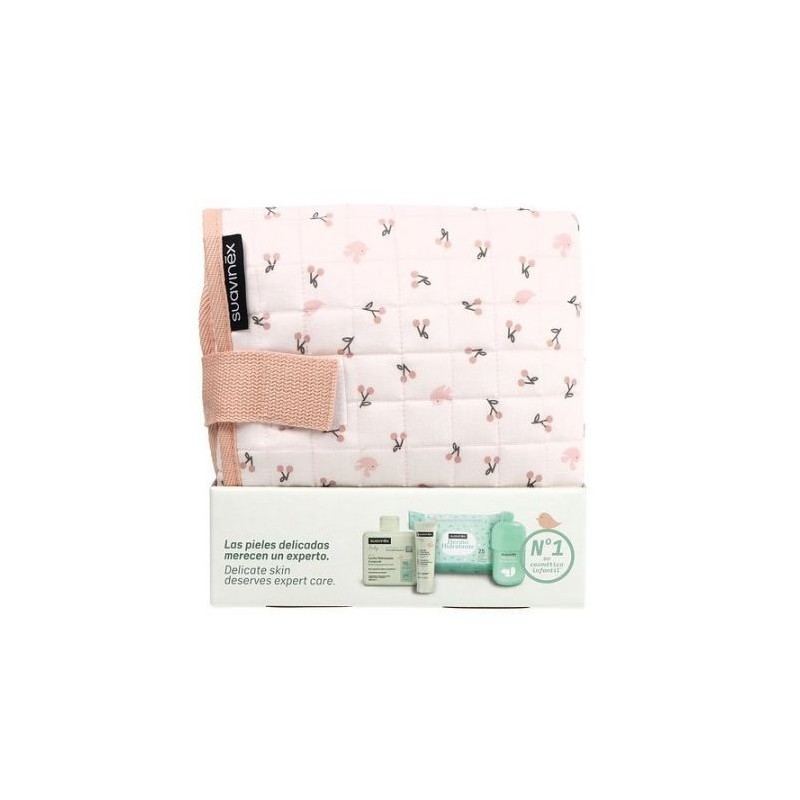 Set regalo para bebé con cambiador portátil y productos de cuidado e higiene esenciales (leche corporal hidratante, toallitas dermohidratantes, pomada protectora reparadora, colonia infantil), ideal para pieles sensibles.