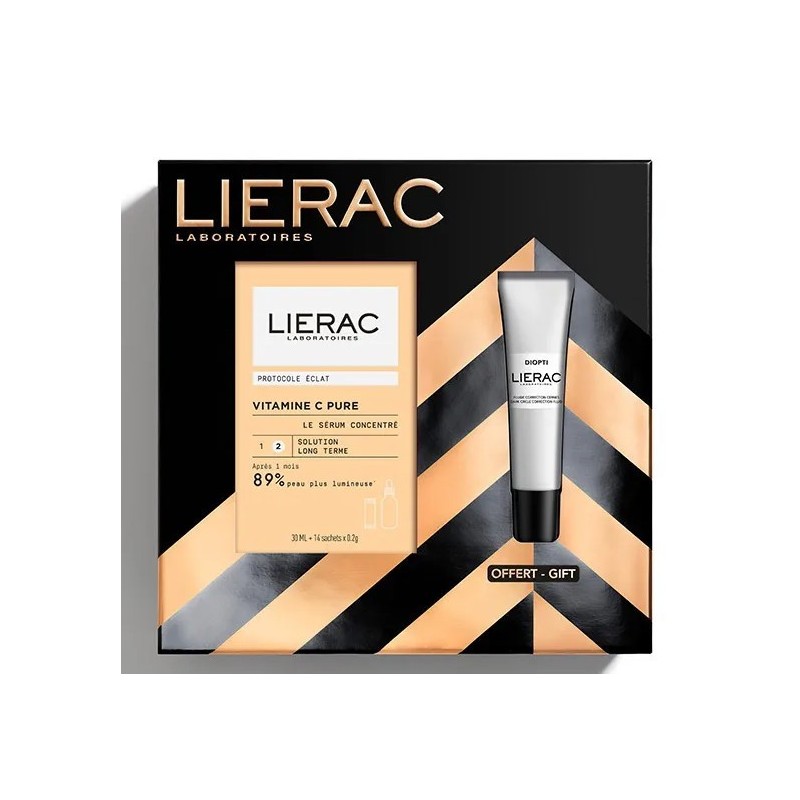 El cofre lierac sérum vitamina c es un tratamiento antioxidante intensivo diseñado para revitalizar la piel y devolverle su luminosidad natural. Su sérum con vitamina c pura al 10 % ayuda a alisar la textura de la piel, unificar el tono y combatir los signos de envejecimiento causados por el estrés oxidativo, dejando el rostro visiblemente más luminoso y revitalizado. Incluye además el fluido corrector de ojeras diopti 15 ml, especialmente formulado para reducir ojeras, bolsas y signos de fatiga en el contorno de ojos. Su textura ligera ilumina la mirada y aporta un efecto alisador inmediato.